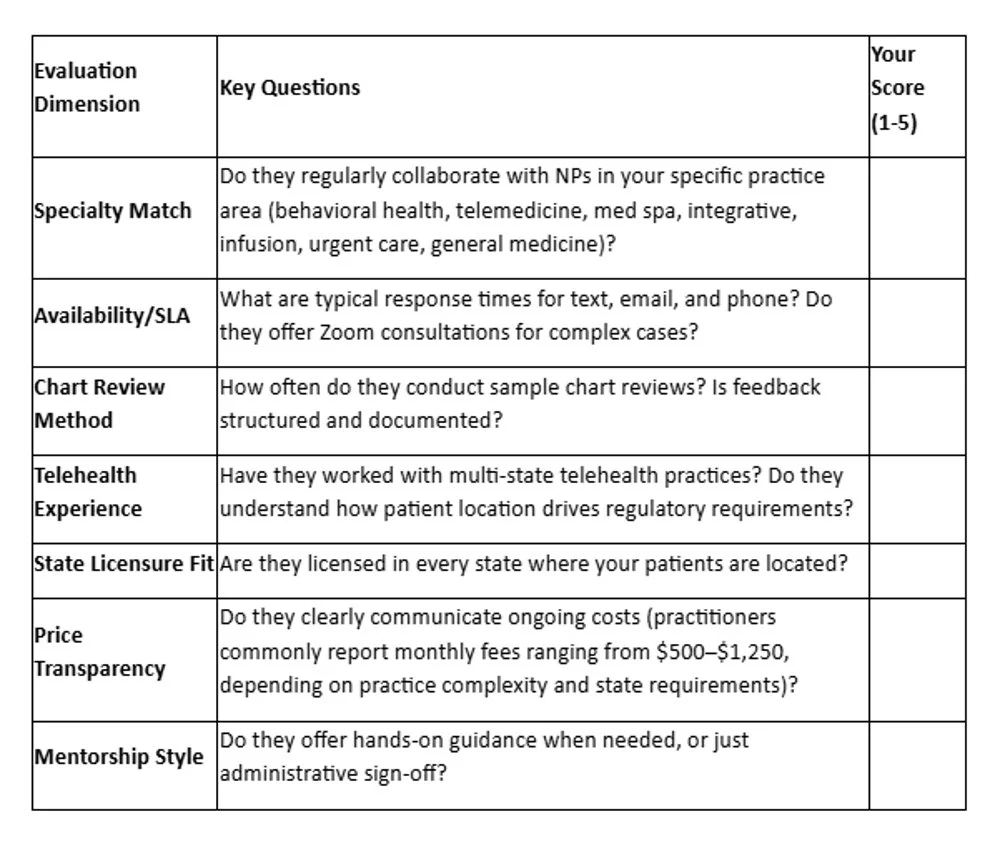 Not all collaborating physicians function as true partners. Use these seven criteria to evaluate potential matches, scoring each on a 1-5 scale:
