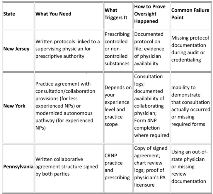 You now have the roadmap. New Jersey requires physician-linked protocols and documented availability. New York's requirements depend on your experience level but always demand proof that collaboration is real, not theoretical. Pennsylvania needs a written collaborative agreement structure with a PA-licensed physician and a defensible chart review process. And for telehealth, the patient's location typically drives which rulebook you follow.